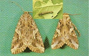Систематическое положение: класс Insecta, отряд Lepidoptera, семейство Noctuidae. После 1963 г. египетская хлопковая совка (ЕХС) и азиатская хлопковая совка (АХС) признаются самостоятельными видами. Граница между современными ареалами египетской и азиатской хлопковыми совками проходит по западному Афганистану, северо-западной Индии, через г. Бомбей и Мальдивскую республику. Синонимы: Hadena littoralis (Boisduval), 1833; Prodenia littoralis (Boisduval), 1879. Распространение Происхождение: Южное и восточное побережье Средиземного моря. Расселение: В настоящее время египетская хлопковая совка (ЕХС) распространена: в Европе (Греция, Италия, Кипр, о. Крит, о. Майорка, Мальта, Португалия, Франция); в Азии (Аравийский п-ов, Бахрейн, Иран, Ирак, Израиль, Иордания, Ливан, Пакистан, Сирия, Турция), а также во всех странах Африки и на Мадагаскаре. В последнее время вредителя неоднократно обнаруживали севернее границы его естественного ареала – в условиях закрытого грунта Великобритании, Германии, Дании, Швеции, Финляндии, Нидерландов. Прогноз появления и распространения на территории РФ: Зона вредоносности ЕХС в России в случае заноса в открытом грунте ограничится Краснодарским и Ставропольскими краями и югом Ростовской области; в закрытом грунте она сможет обосноваться и наносить вред растениям на всей территории страны. Особенности морфологии Бабочка в сравнении с бабочками иных представителей рода Spodoptera, крупная; размах крыльев составляет 31-41 мм. Крылья светло-коричневые, с характерным рисунком, состоящим из светлых полос и пятен. Внешнее поле светло-серое; в его средней части ближе к подкраевой полоске расположено темное пятно. Характерной особенностью окраски крыльев является светло-охристый мазок, лежащий в срединном поле переднего крыла, и следом за ним, что очень важно для предварительной идентификации, на темном фоне ближе к вершине наружной перевязи – характерный рисунок, напоминаю цифру 4. Этот признак является определяющим для ЕХС, так как большинство других видов совок имеет ясные очертания округлого и почковидного пятна, и характерный признак – (4) у близкородственных видов отсутствует. Однако следует учесть, что указанный характерный рисунок можно встретить у следующих видов совок р. Spodoptera, обитающих на Североамериканском континенте: S. ornithogalli (Guenee), S. latifascia (Walker), S. praefica (Grota). Важно также знать, что рисунок крыла ЕХС практически не отличается от рисунка крыла АХС. В связи с этим, при необходимости различить эти виды, прибегают не к анализу окраски крыльев, а к анализу по гениталиям. Заднее крыло белое, жилки не затемненные. Крылья в спокойном состоянии сложены кровлеобразно. Грудь, брюшко и ноги светло-коричневые. Волосяные чешуйки на кончике брюшка оранжево-коричневые. Длина вальвы самца превышает ее ширину немного менее чем в два раза (рис.3). Класпер широко расширенный. Корнутус эдеагуса тупо–конечный, закругленный на вершине с маленьким субапикальным зубчиком и пучком иглообразных волосков. Ункус одинарный, постоянно суживающийся к вершине, серповидно изогнут. Юкста прямоугольная или трапецевидная, в то время как у АХС она треугольная . Копулятивная сумка самки с коротким широким сигнумом и выраженным заостренным базальным дивертикулом с маленькой округлой лопастью на противоположной стороне. Проток совокупительной сумки в два раза меньше чем у АХС (рис.2 ) У ЕХ