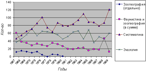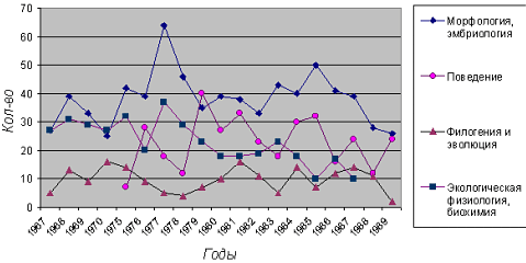 Рис 1. Общая динамика публикаций по рубрикам Зоологического журнала (1967-1970 г.г., и 1975-1989 г.г.)