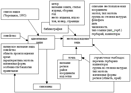 Вместе с тем, заносные виды в региональных флорах составляют в среднем около 20%, а в городах этот процент существенно выше (Алексеев, 2000). Возрастающая роль адвентивного компонента и значительное число новых находок послужили поводом для сбора информации, представляющей собой разрозненные сведения о местонахождении видов. Только будучи собранным воедино, материал позволяет выяснить периоды проникновения вида в тот или иной регион, частоту заноса вида, устойчивость популяции, дальнейшее распространение растения-пришельца, а также активизацию расселения вида в различных регионах. Значительный объем данных, накопленных за многие годы в работах различных специалистов и отраженных в литературе, необходимость их обобщения, обеспечение оперативного доступа к данным, автоматизация сбора, хранения, обработки и передачи информации, послужили предпосылками для создания БД по адвентивной флоре.