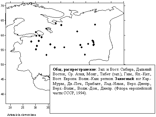 Рис. 2. Распространение Artemisia sieversiana Willd. на территории Восточной Европы. При описании ареала использовано районирование, принятое во Флоре европейской части СССР.