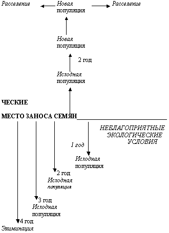 Поведение адвентивного вида на новом месте обитания в первую очередь определяется экологическими условиями (рис.1). Если они не соответствуют его требованиям, то растение не сможет пройти полный цикл развития и образовать семена.